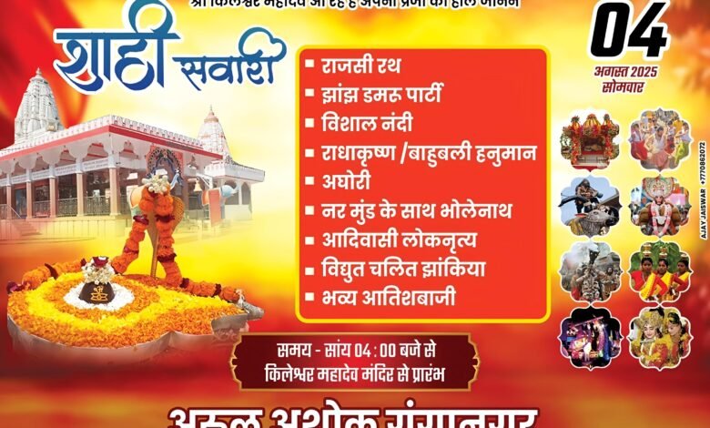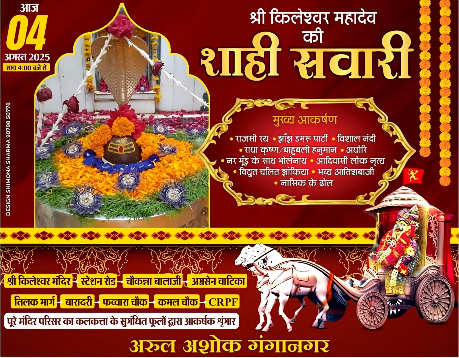 नीमच के महांकाल के नाम से प्रसिद्ध श्री किलेश्वर महादेव की शाही सवारी आज श्रावण माह के अंतिम को शहर के प्रमुख मार्गों से धूमधाम से निकलेगी। चमत्कारिक श्री किलेश्वर महादेव विशेष श्रृंगारित शाही रथ में विराजित रहेंगे और जनता के हाल जानने के लिए शहर भ्रमण करेंगे। युवा समाजसेवी अरूल अशोक अरोरा गंगानगर के नेतृत्व में शाही सवारी की तमाम तैयारियों को अंतिम रूप दे दिया गया है। सावन माह के अंतिम सोमवार के पूर्व श्री किलेश्वर महादेव परिसर को कलकत्ता से मंगाए गए 101 क्विंटल फूलों से सजाया गया है। पूरा मंदिर से फूलों की खूबशू से महक उठा है।