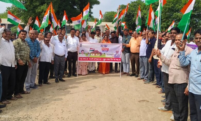 हर घर तिरंगा हर घर स्वच्छता अभियान तहत मंगलवार को नगर कुकडेश्वर में न.पा.अध्यक्ष श्रीमती उर्मिला महेंद्र पटवा,उपाध्यक्ष श्रीमती सोनाली उज्जवल पटवा एवं मुख्य नगर पालिका अधिकारी श्री कमल सिंह परमार, श्री मदन रावत,एवं समस्त पार्षदगणों, जनप्रतिनिधि,गणमान्य नागरिक शिक्षक-शिक्षिकाओं एंव छात्र-छात्राओं ने नगर परिषद प्रांगण से तिरंगा रैली आयोजित की, जो प्रमुख मार्गो से होती हुई, शासकीय बालक उच्च माध्यमिक विद्यालय में मानव श्रृंखला बनाकर, विशाल रैली का समापन हुआ।