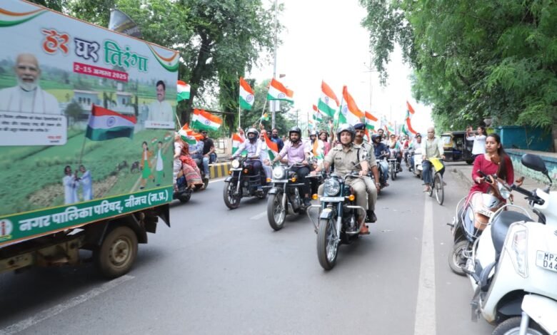 हर घर तिरंगा अभियान के तहत विधायक श्री दिलीप सिह परिहार, कलेक्टर श्री हिमांशु चंद्रा,पुलिस अधीक्षक श्री अंकित जायसवाल, अतिरिक्त पुलिस अधीक्षक श्री नवलसिंह सिसोदिया, न.पा.अध्यक्ष श्रीमती स्वाति चौपड़ा की उपस्थिति में पुरानी नगरपालिका कार्यालय परिसर नीमच से बुधवार को वृहद तिरंगा वाहन रैली आयोजित की गई। इस विशाल तिरंगा रैली में विधायक श्री परिहार, कलेक्टर श्री हिमांशु चंद्रा ,एसपी श्री अंकित जायसवाल, जिला पंचायत सीईओ श्री अमन वैष्णव एवं अन्य अधिकारियों ने तिरंगा हाथ में लेकर बाईक वाहन पर, सवार होकर रैली के साथ नीमच शहर के विभिन्न प्रमुख मार्गों का भ्रमण कर नागरिकों को हर घर तिरंगा अभियान के तहत अपने-अपने घरों पर तिरंगा लगाने का संदेश दिया।