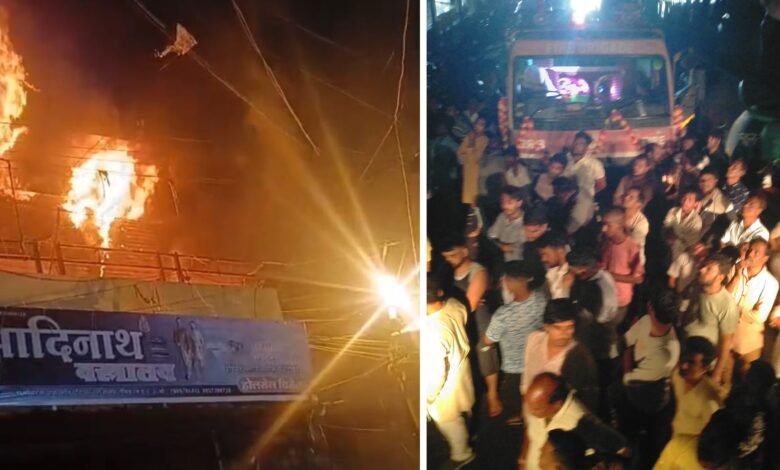नगर के प्रमुख श्री बड़े बालाजी मंदिर के समीप नया बाजार में नीमच निवासी प्रदीप भामावत के व्यवसायिक संस्थान आदिनाथ वस्त्रालय शोरूम भवन की दुसरी मंजिल पर रात्रि लगभग 12 .20 बजे अचानक आग लग गई थी उसके बाद नागरिकों ने फायर ब्रिगेड को सूचना की और आधे घंटे में नपा की फायर ब्रिगेड टीम व टैंकर पहुंचे और आग बुझाने का कार्य शुरू किया इस अवसर पर मध्य प्रदेश पश्चिम क्षैत्रिय विद्युत वितरण कंपनी के इलेक्ट्रिक लाइन मेन द्वारा लाइट विधुत कनेक्शन काट दिया गया और उच्च अधिकारियों को सूचना प्रेषित की। रात को 1:50 बजे तक साड़ी के गोदाम की दुसरी मंजिल से निरंतर काला धुआं निकलता रहा।नपा परिषद की फायर ब्रिगेड टीम और अफीम फैक्ट्री क्षारोद कारखाना सीआईएसएफ की टीम मौके पर पहुंची और फायर ब्रिगेड टीम के कर्मचारियों द्वारा आदिनाथ वस्त्रालय की दूसरी मंजिल पर सीढ़ी लगाकर चढ़े और अन्दर से बंद शटर को तोड़ने के लिए 30 मिनिट तक सबल हथोड़े से शटर को तोड़ने का परिश्रम निरंतर करते रहे आग लगने की घटना की सूचना फैलने के बाद जन सैलाब उमड़ा ।शहर के विनोबा गंज क्षेत्र गरीब बस्ती, गिहारा मोहल्ला, नया बाजार एवं बिहार गंज कोली मोहल्ला आदि क्षैत्रवासियों व नागरिकों द्वारा आग बुझाने के लिए निरंतर सहयोग किया गया। आदिनाथ कपड़े के तीन मंजिला बिल्डिंग की दूसरी मंजिल में आग लगी उस मंजिल की सभी खिड़कियों के कांच को तोड़ा गया और वहां से फायर ब्रिगेड का पानी प्रेशर से डालकर आग बुझाने का कार्य किया गया। आग तेजी से फैल सकती थी लेकिन आदिनाथ साड़ी शोरूम के एक तरफ कोली मोहल्ला में जाने वाली गली है और दूसरी तरफ एक खाली प्लाट होने से आग कहीं भी नहीं फैल पाई।नगर पालिका की फायर ब्रिगेड के कर्मचारियों ने भी अपना काम किया लेकिन नगर पालिका कर्मचारियों के पास संसाधन व प्रशिक्षण का अभाव सामने देखा गया सीआईएसएफ की फायर संसाधनों से युक्त प्रशिक्षित टीम आते ही आग बुझाने में तेजी से कार्यवाही आगे बढ़ी। इस अवसर पर अफीम फैक्ट्री फायर ब्रिगेड टीम के एएसआई प्रदीप कुमार के नेतृत्व में फायर फाइटर टीम के 6 कर्मचारियों द्वारा आग बुझाने के लिए संघर्ष किया गया। तेज काले धुएं के बावजूद भी टीम ने आग बुझाने में तत्परता दिखाई। इस अवसर पर नगर पालिका के तीन फायर ब्रिगेड और दो पानी के टैंकर मौके पर पहुंचे उनके साथ लगभग 15 कर्मचारियों की टीम पहुंची। और उन्होंने आग बुझाने का काम किया। आग पर रात 2.45बजे तक नियंत्रण कर लिया था । दुकान संचालक प्रदीप कुमार भामावत से बात करने पर उन्होंने बताया कि कुर्ते पजामे पैंट शर्ट साड़ियां ड्रेस मटेरियल ब्लाउज पेटीकोट जैकेट सहित विभिन्न रेडिमेड कपड़े के स्टॉक का परीक्षण करने के बाद जले हुए सामग्री को अलग से हटाने के बाद ही आग में क