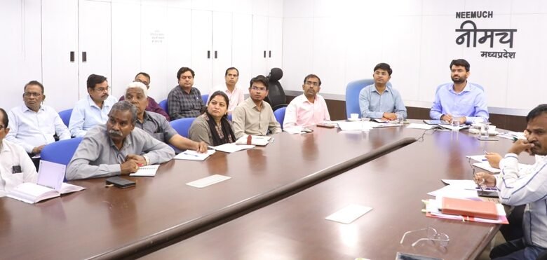 नीमच के एन.आई.सी.कक्ष में कलेक्टर श्री हिमांशु चंद्रा, जिला पंचायत सीईओ श्री अमन वैष्णव, शहरी विकास परियोजना अधिकारी श्री पराग जैन, जिला अधिकारी, सभी सीएमओ भी उपस्थित थे।