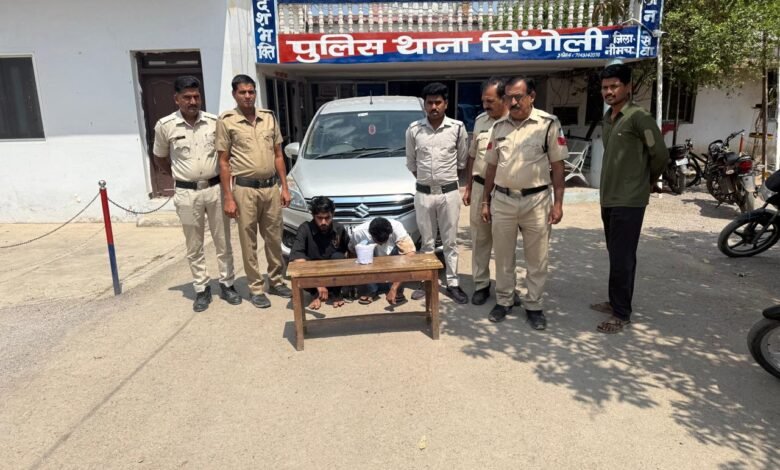 पुलिस मुख्यालय भोपाल द्वारा चलाये जा रहे अवैध मादक पदार्थ तस्करो के विरूद्ध प्रदेश व्यापी नशाविरोधी अभियान के तहत श्रीमान पुलिस अधीक्षक महोदय श्री अंकित जायसवाल के निर्देशन में तथा श्रीमान अतिरिक्त पुलिस अधीक्षक श्री नवलसिंह सिसोदिया एवं श्रीमान एसडीओपी श्री रोहित राठोर जावद के मार्गदर्शन में अवैध मादक पदार्थ तस्करी के विरुध्द प्रभावी कार्यवाही करते हुये सिंगोली थाना प्रभारी निरीक्षक श्री जितेन्द्र कुमार वर्मा के नेतृत्व में पुलिस टीम सिंगोली द्वारा आरोपियो जुनैद अख्तर व दानीश उर्फ शानू के कब्जे से मारूती सुजूकी अरटिगा सिल्वर रंग की कार RJ17UA/6450 से 160 ग्राम अवैध मादक पदार्थ एम.डी जप्त कर आरोपियो 1. जुनैद अख्तर पिता जाकीर हुसैन जाति मुसलमान उम्र 25 साल निवासी कोटरी फकीरो की मस्जिद के पीछे छावनी कोटा राजस्थान 2. दानीश उर्फ शानू पिता निजामुद्दीन जाति मुसलमान उम्र 33 साल निवासी कोटरी फकीरो की मस्जिद के पीछे छावनी कोटा राजस्थान को किया गिरफ्तार।