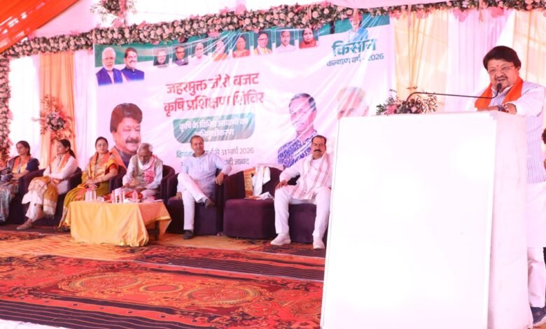 जिले एवं प्रदेश के किसान भाई रसायन मुक्त, जीरो बजट की खेती को अपना कर, भावी पीढ़ी को स्वस्थ बनाने एवं स्वस्थ समाज के निर्माण में अपना महत्वपूर्ण योगदान दे। पद्मश्री सुभाष पालेकर जी ने कृषि क्षेत्र में अनेको प्रयोग कर जीरो बजट रसायन मुक्त कृषि पद्धति तैयार की है। इस कृषि पद्धति का उपयोग कर किसान भाई, जीरो बजट खेती करें। यह बात प्रदेश के नगरीय प्रशासन मंत्री श्री कैलाश विजयवर्गीय ने शनिवार को कृषि उपज मण्डी जावद में आयोजित जहर मुक्त जीरो बजट कृषि पर आधारित चार दिवसीय प्रशिक्षण शिविर को मुख्य अतिथि के रूप में सम्बोधित करते हुए कही। इस मौके पर विधायक श्री दिलीप सिह परिहार, जावद विधायक श्री ओमप्रकाश सखलेचा, मुख्य वक्ता पद्मश्री श्री सुभाष पालेकर, जिला अध्यक्ष श्रीमती वंदना खण्डेलवाल, नीमच न.पा.अध्यक्ष श्रीमती स्वाति चौपड़ा, पूर्व सांसद श्री सुभाष जी, पूर्व विधायक कटनी श्री कैलाश जी व अन्य जनप्रतिनिधिगण उपस्थित थे।