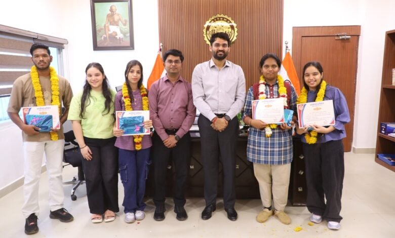 कलेक्टर श्री हिमांशु चंद्रा ने शनिवार को कलेक्टोरेट में आयोजित एक सादे समारोह में 10वीं, 12वीं की बोर्ड परीक्षाओं में प्रवीण्य सूची में स्थान प्राप्त करने वाले नीमच जिले के छात्र-छात्राओं और उनके अभिभावकों से संवाद कर, उनका केरियर मार्गदर्शन किया। कलेक्टर ने प्रवीण्य सूची में शामिल जिले के उत्कृष्ट विद्यालय नीमच के छात्र प्रमोद, सांदीपनी विद्यालय नीमच की छात्रा सुश्री प्रियांशी, सिंगोली की छात्रा प्रांजल सोनी एवं विसडम स्कूल की छात्रा मंतशा गोरी, को प्रशस्ति पत्र एवं उपहार भेटकर सम्मानित भी किया।