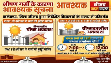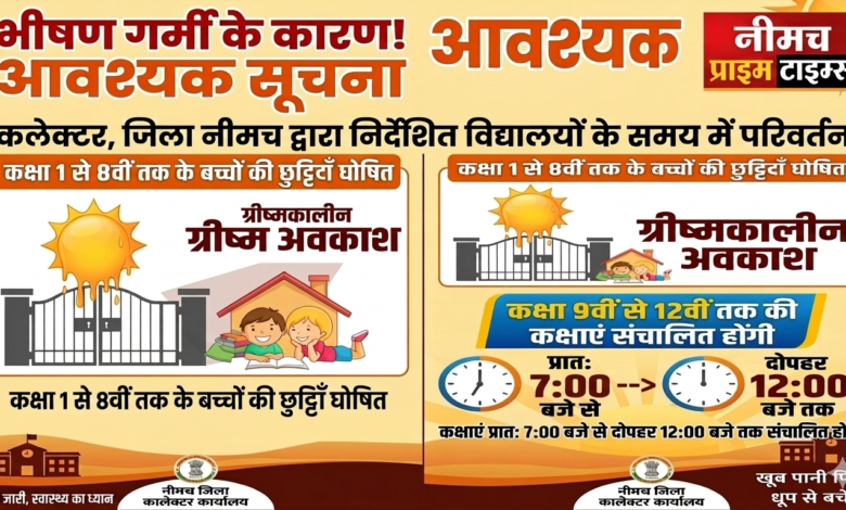 भीषण गर्मी के कारण तापमान में हुई वृद्धि को दृष्टिगत रखते हुए कलेक्टर श्री हिमांशु चंद्रा द्वारा नीमच जिले में संचालित शासकीय, अशासकीय, सी.बी.एस.ई., आई.सी.एस.ई., माध्यमिक शिक्षा मंडल एवं समस्त बोर्ड से संबद्ध विद्यालयों की कक्षा नर्सरी से कक्षा 8वीं तक के छात्र-छात्राओं हेतु 27 से 30 अप्रैल 2026 तक जिले के समस्त विद्यालयों में अवकाश घोषित किया गया है। जिला शिक्षा अधिकारी श्री सुजान मल मांगरिया द्वारा जारी आदेशानुसार कक्षा 9वीं से 12वीं तक की कक्षाओं का संचालन प्रातः 7:00 बजे से 12:00 बजे के मध्य ही किया जाएगा। तदुपरांत, मध्यप्रदेश शासन स्कूल शिक्षा विभाग मंत्रालय, वल्लभ भवन, भोपाल के आदेशानुसार 01 मई 2026 से 15 जून 2026 तक विद्यार्थियों का ग्रीष्मकालीन अवकाश घोषित किया गया है।